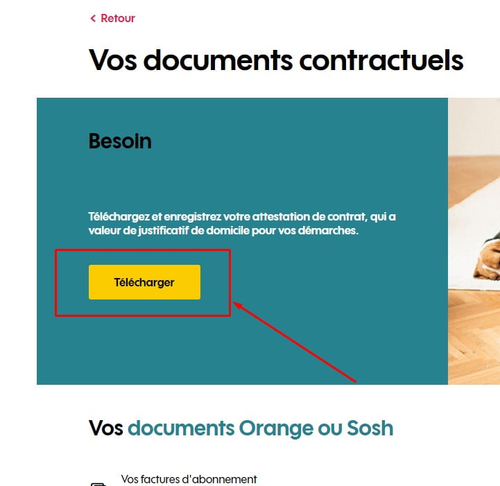 Vous atterrirez alors sur une page comportant un beau bouton, qui vous délivrera le précieuse sésame: votre attestation de contrat Sosh, qui fera office de justificatif de domicile pour vos démarches.