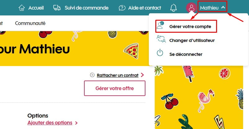En haut à droite toujours, cliquez sur votre prénom, puis sur « Gérez votre compte »