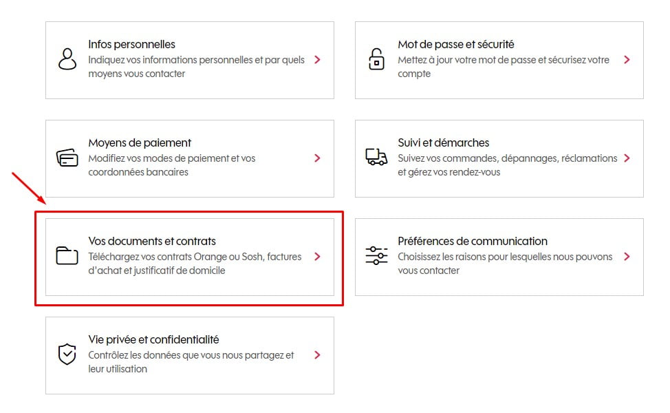 Une fois cliqué, vous tomberez sur une page recensant plusieurs actions possible au sein de votre compte client Sosh, dont celui qui nous intéresse : « Vos Documents et contrats ». Cliquez dessus.